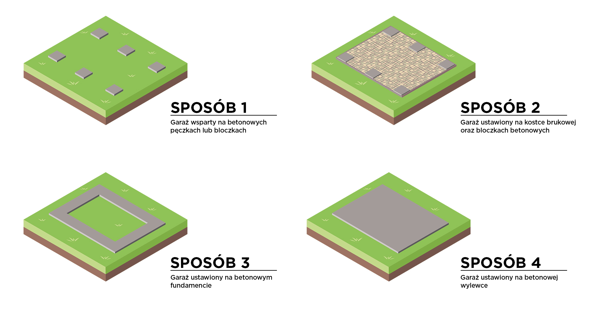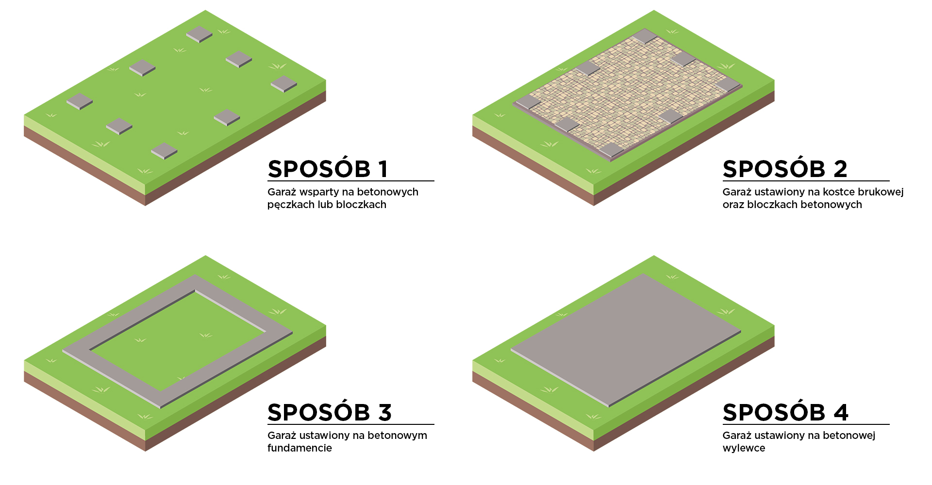 Aby przygotować stabilne podłoże pod garaż należy ustawić płyty betonowe (30x30cm lub 50x50cm) z przodu garażu, na środku oraz na końcu garażu. Bloczki betonowe musza być ułożone na odpowiednio utwardzonej powierzchni/podłożu.