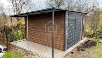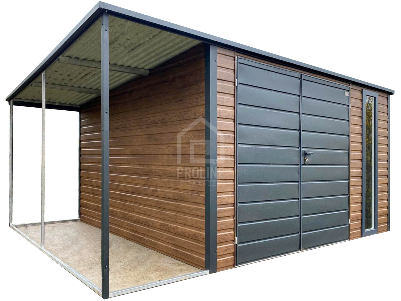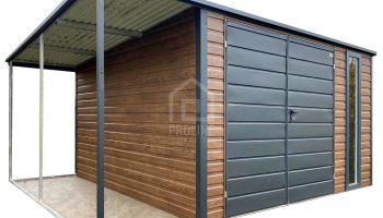 • szerokość : 3,5m • długość : 3,5m • wiata : 1×3,5 m • dach : spad w tył kolor : antracyt mat 7016 • brama dwuskrzydłowa 180×200 cm przetłoczenie T17 poziom kolor : antracyt mat 7016 • 1x okno PCV 40×200 cm kolor antracyt • przetłoczenie ścian T7 poziom kolor : ciemny orzech • wysokość ścian przód : 214 cm • wysokość ścian tył : 190 cm • Konstrukcja z profili zamkniętych ocynk mix • zamek i klucze • nity + wkręty w kolorze garażu • obróbki ścian i dachu