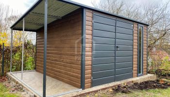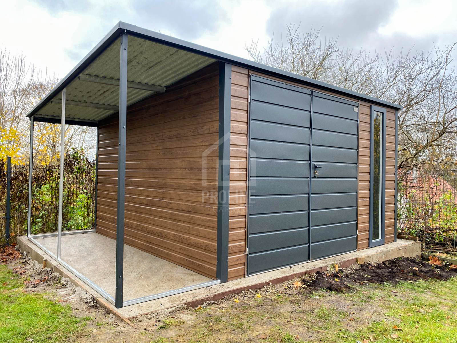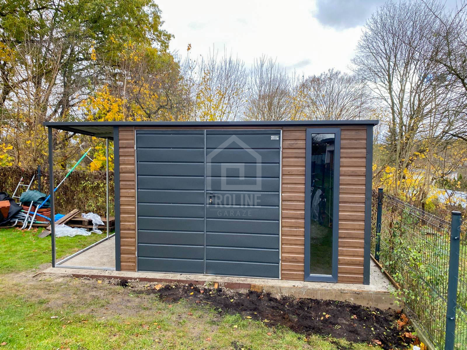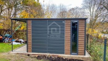 Domek ogrodowy – schowek – 3,5×3,5m – wiata 1×3,5m – brama dwuskrzydłowa – okno – drewnopodobny – dach spad w tył PLG236