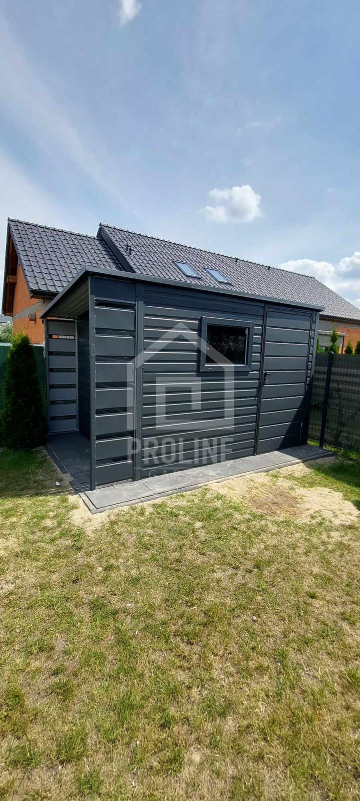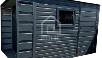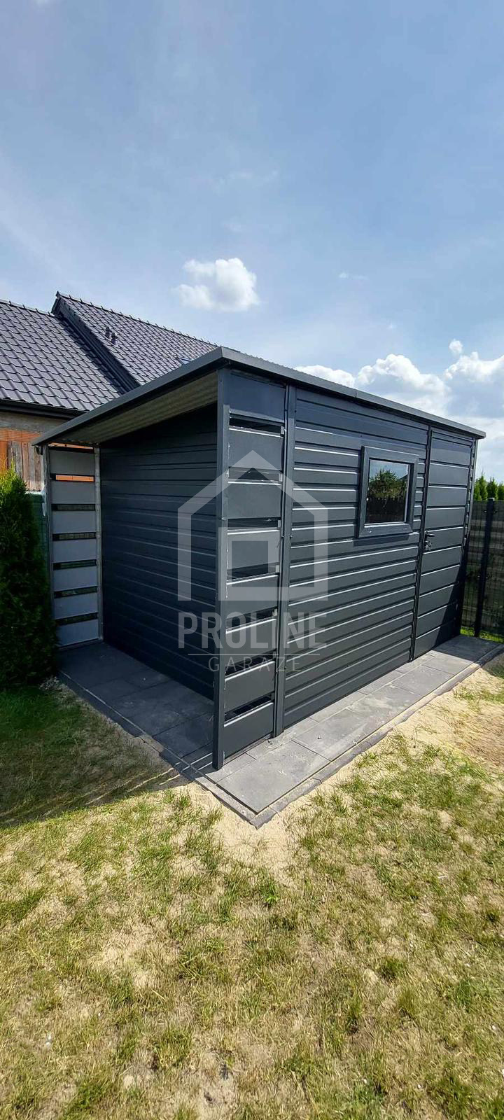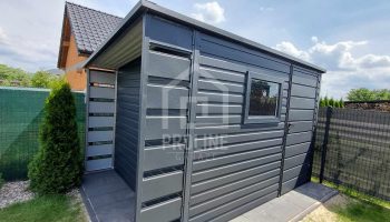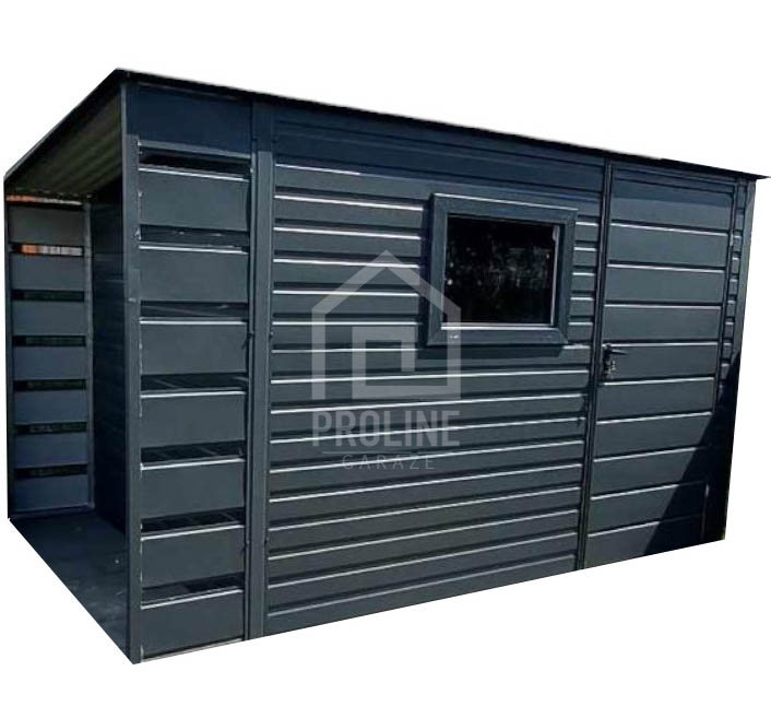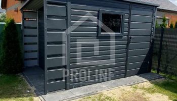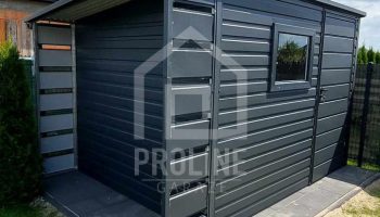 / Schowek – domek ogrodowy 2,5×2,5m + wiata 0,5m – drzwi – okno – antracyt – dach spad w tył PLG147