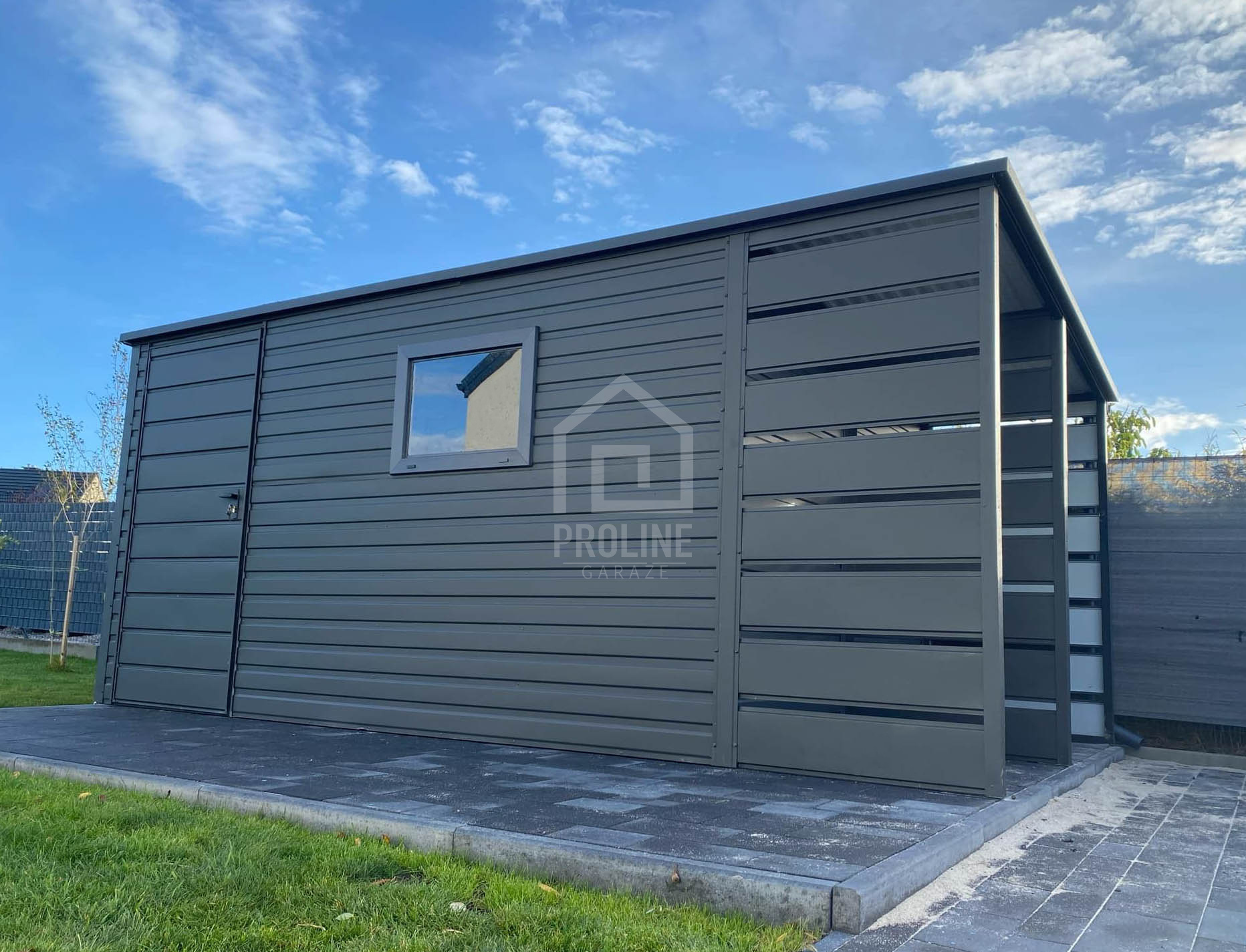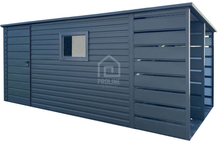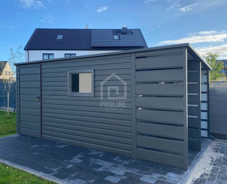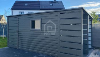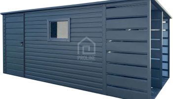/ Schowek – Domek ogrodowy 3,8×2,5 + wiata 1,2 – drzwi – okno – Antracyt – dach spad w tył PLG101