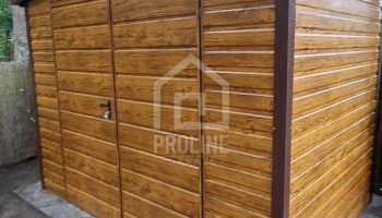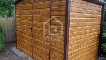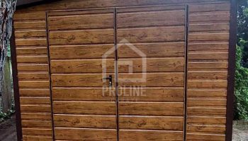 / Schowek – domek ogrodowy 3x2m – Brama dwuskrzydłowa – jasny orzech – drewnopodobny – rynny – dach dwuspadowy PLG152
