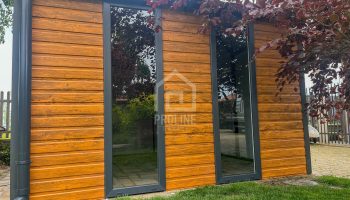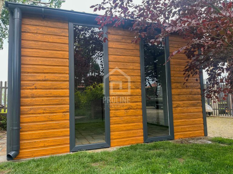 Schowek – Domek Ogrodowy 3x3m – drzwi – 2x okno – jasny orzech drewnopodobny – dach dwuspadowy w przód – rynny PLG163