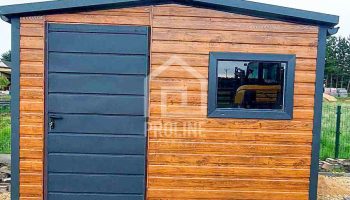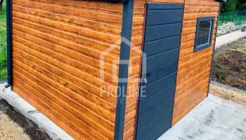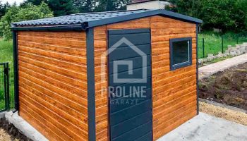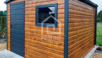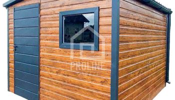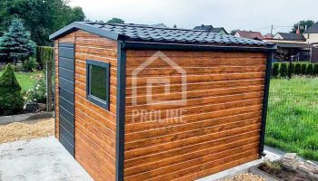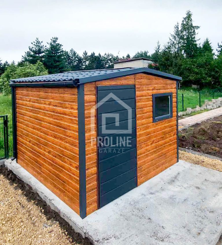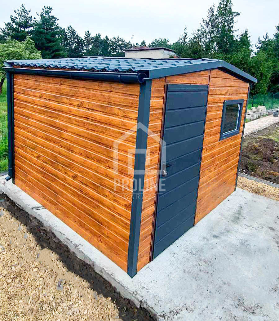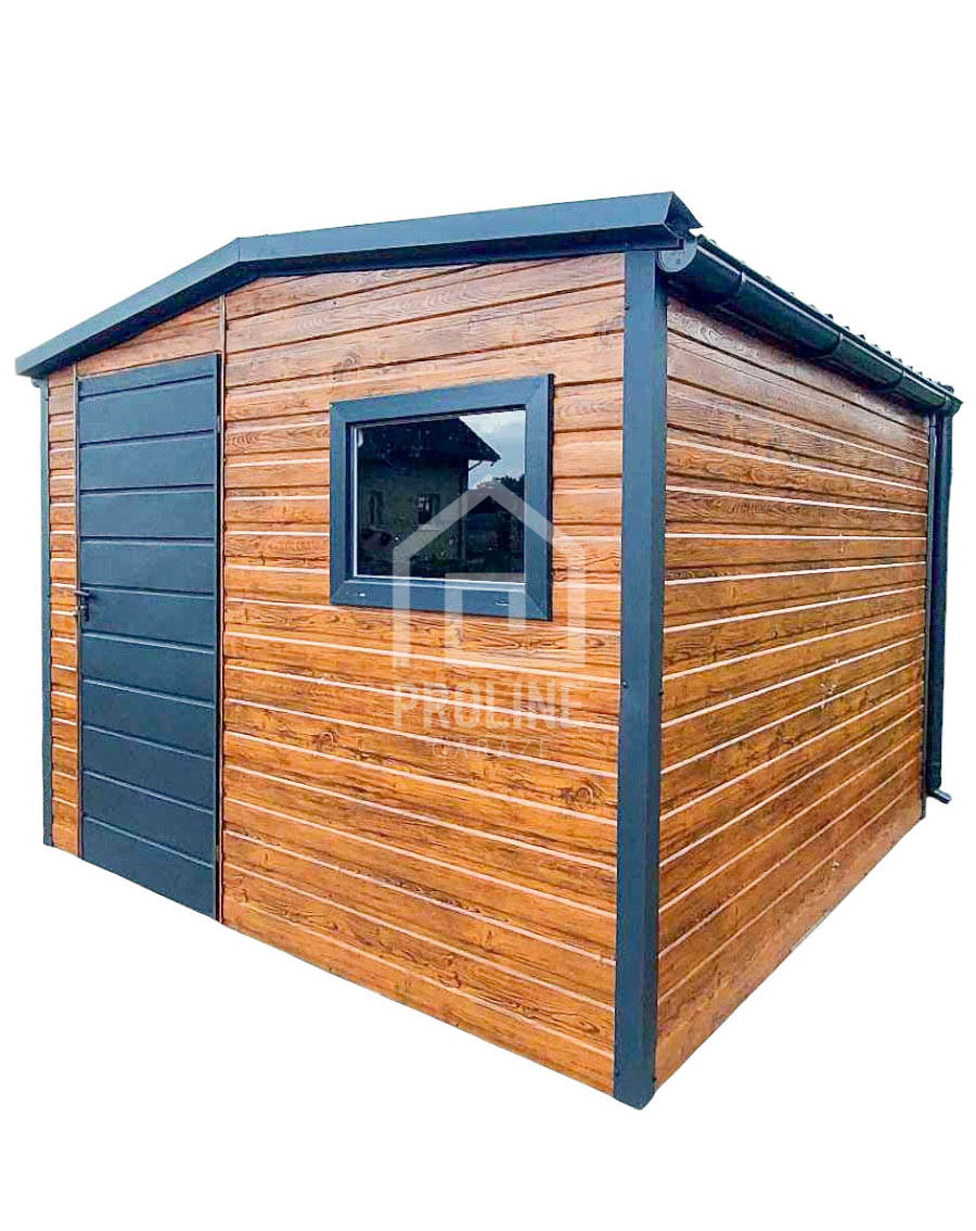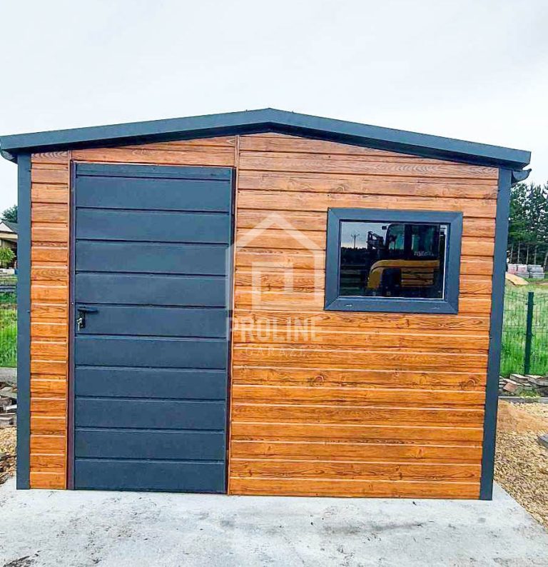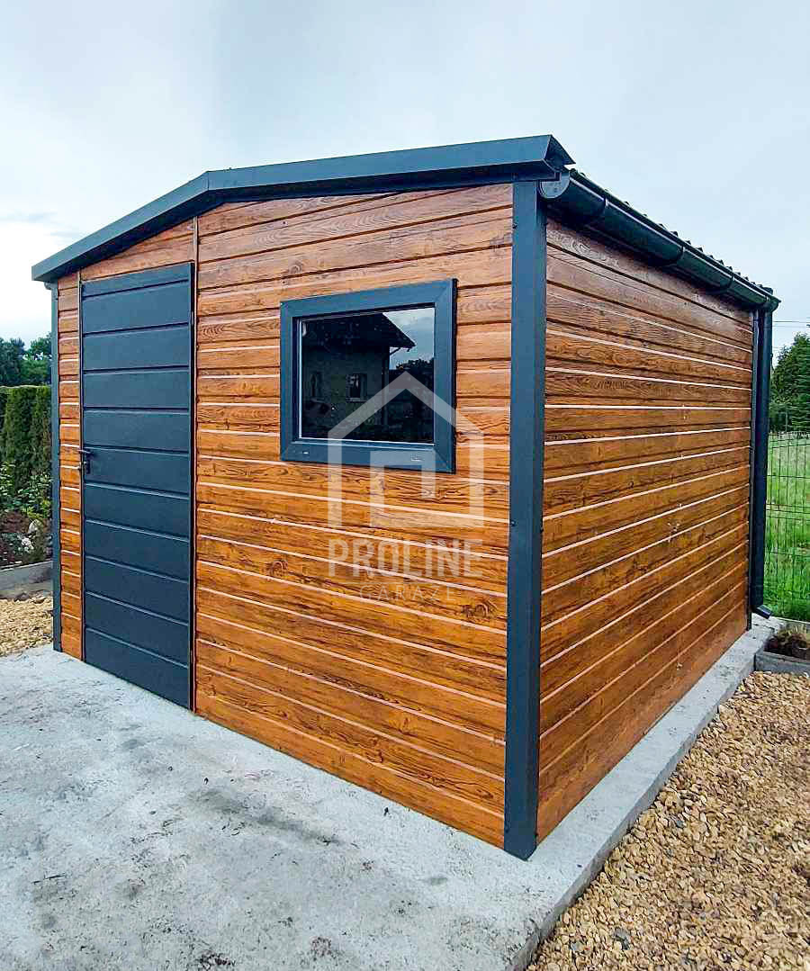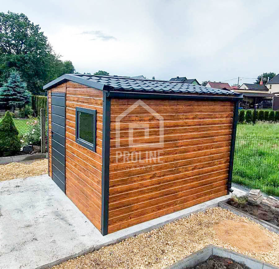 / Schowek – domek ogrodowy 3x4m – drzwi – okno – jasny orzech – drewnopodobny – antracyt – blachodachówka – rynny – dach dwuspadowy PLG154