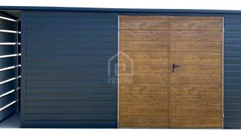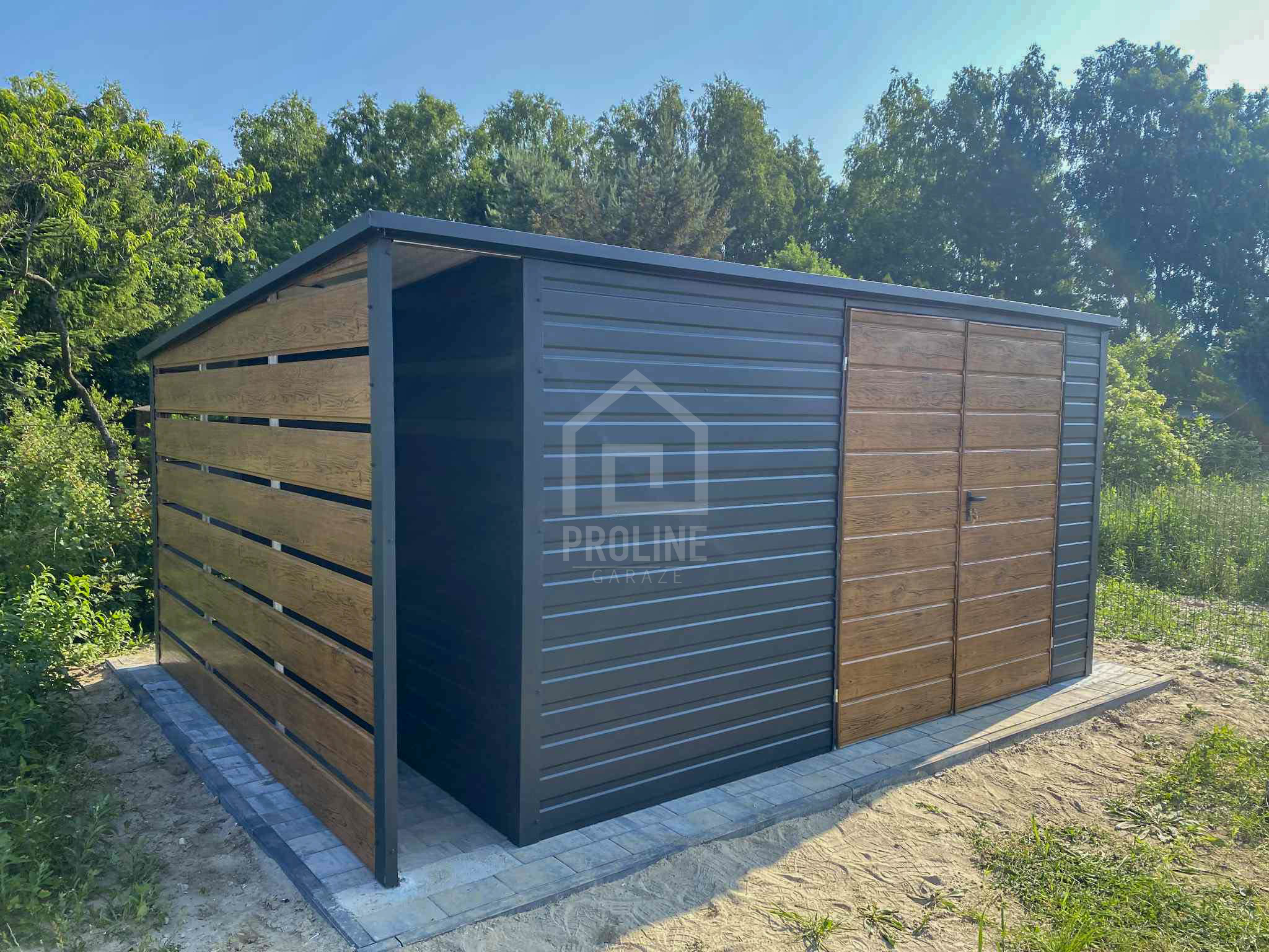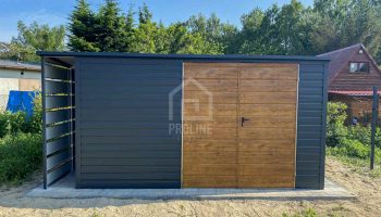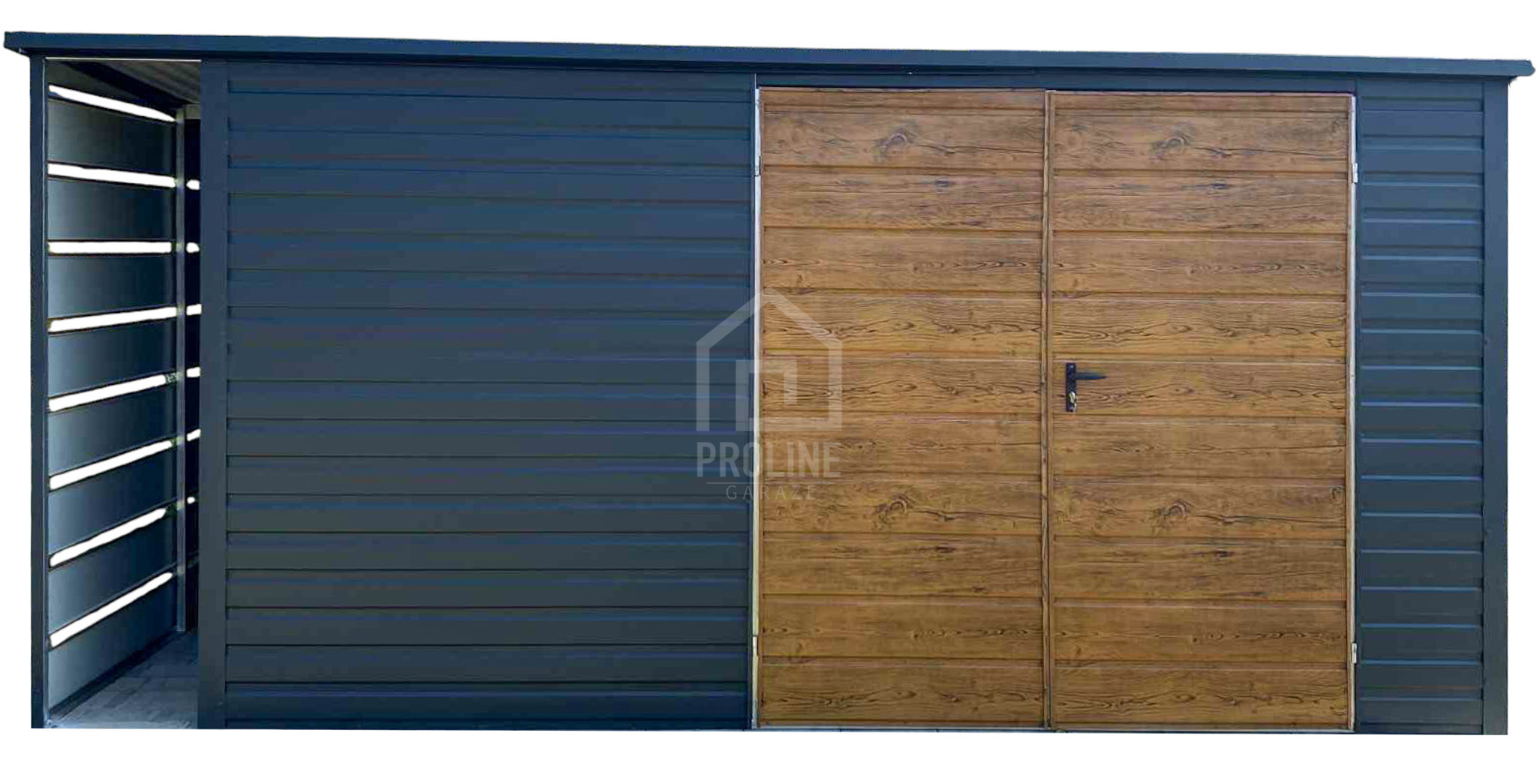 Schowek – Domek Ogrodowy 4,5x2m + wiata 0,5m – Brama – jasny orzech – antracyt – dach spad w tył PLG188
