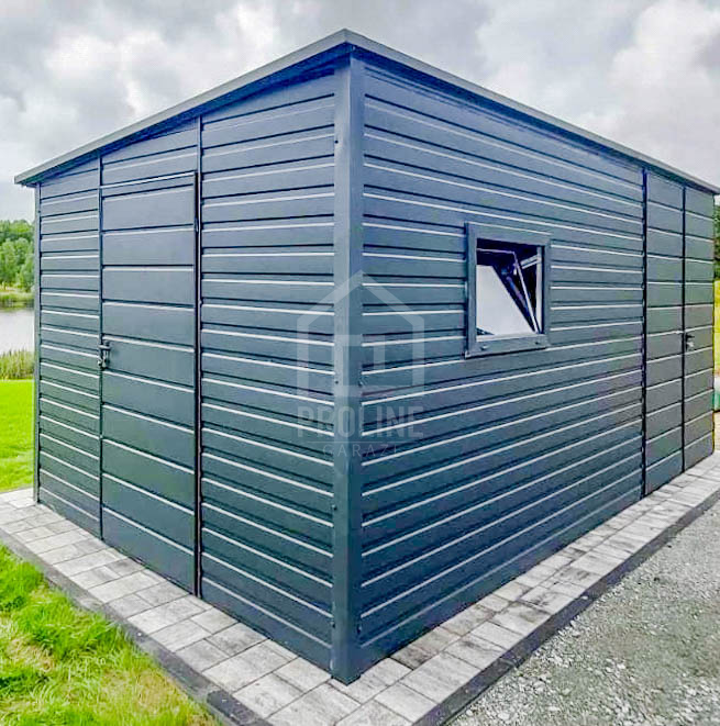 Schowek – Domek Ogrodowy 4×2,5m Brama Dwuskrzydłowa – Drzwi – Okno – Antracyt – Dach spad w tył PLG156