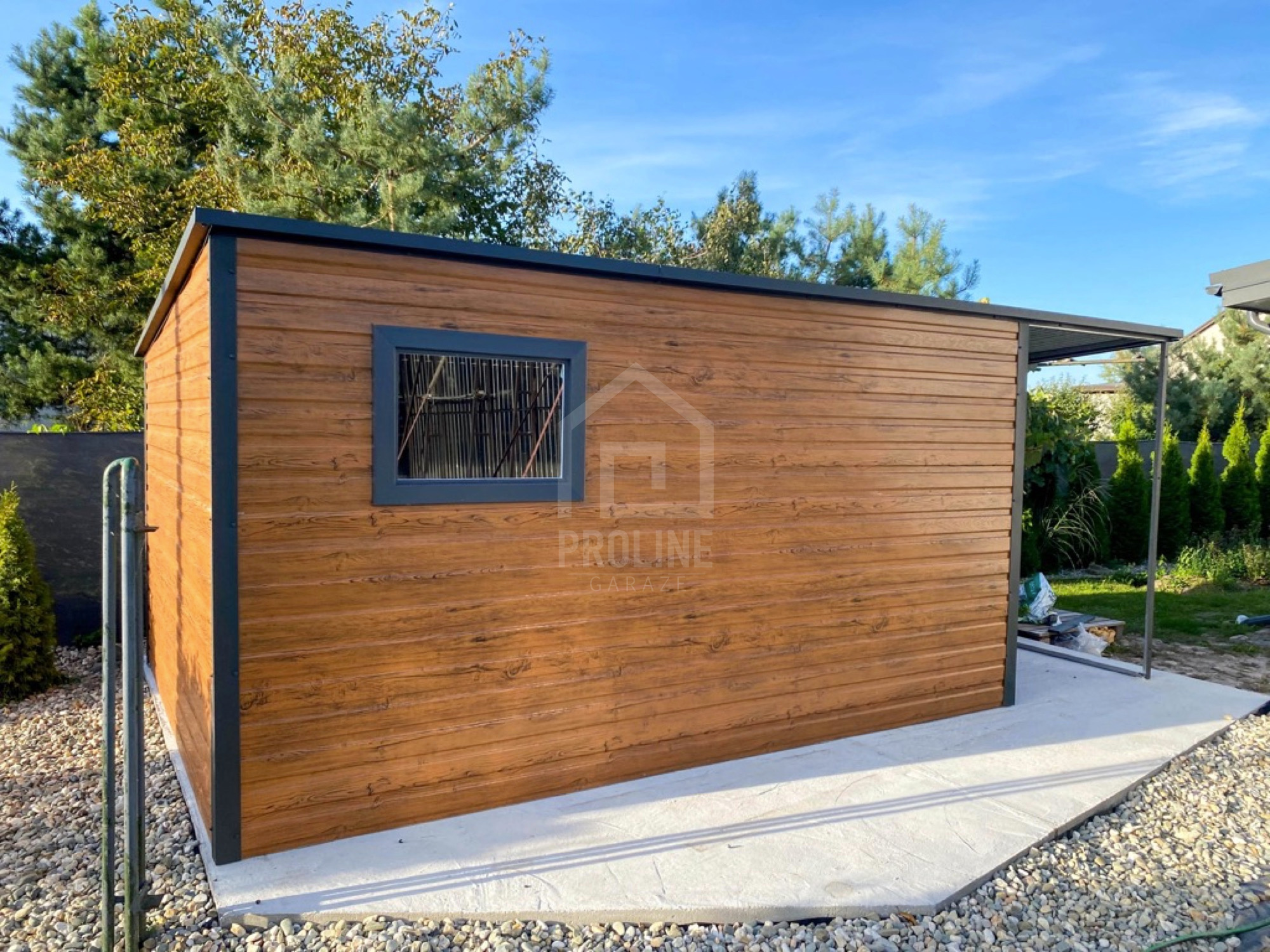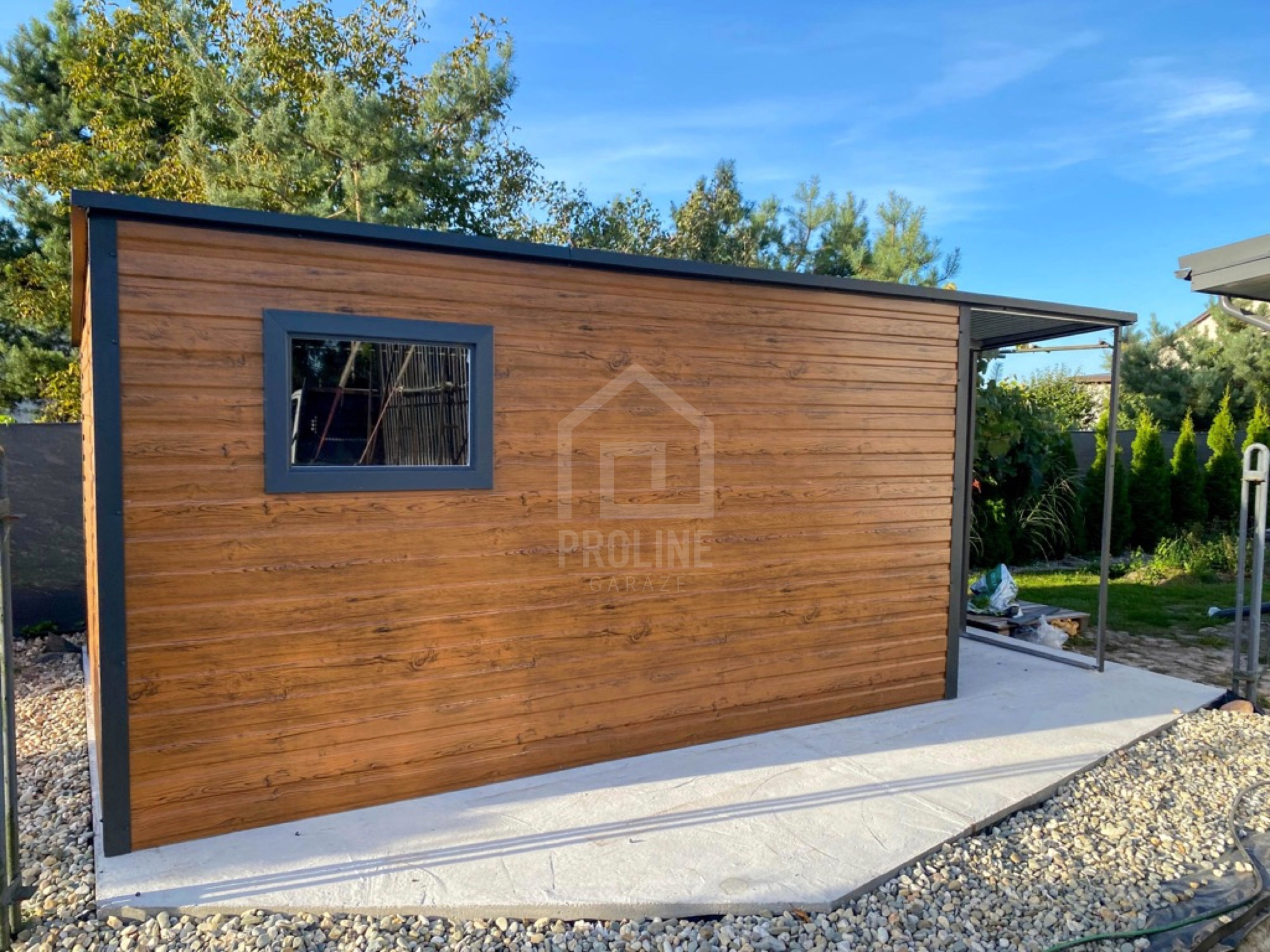 • wiata 1,5x2m zabudowana panelami w tylnej części oraz w połowie ściany bocznej kolor : antracyt mat 7016