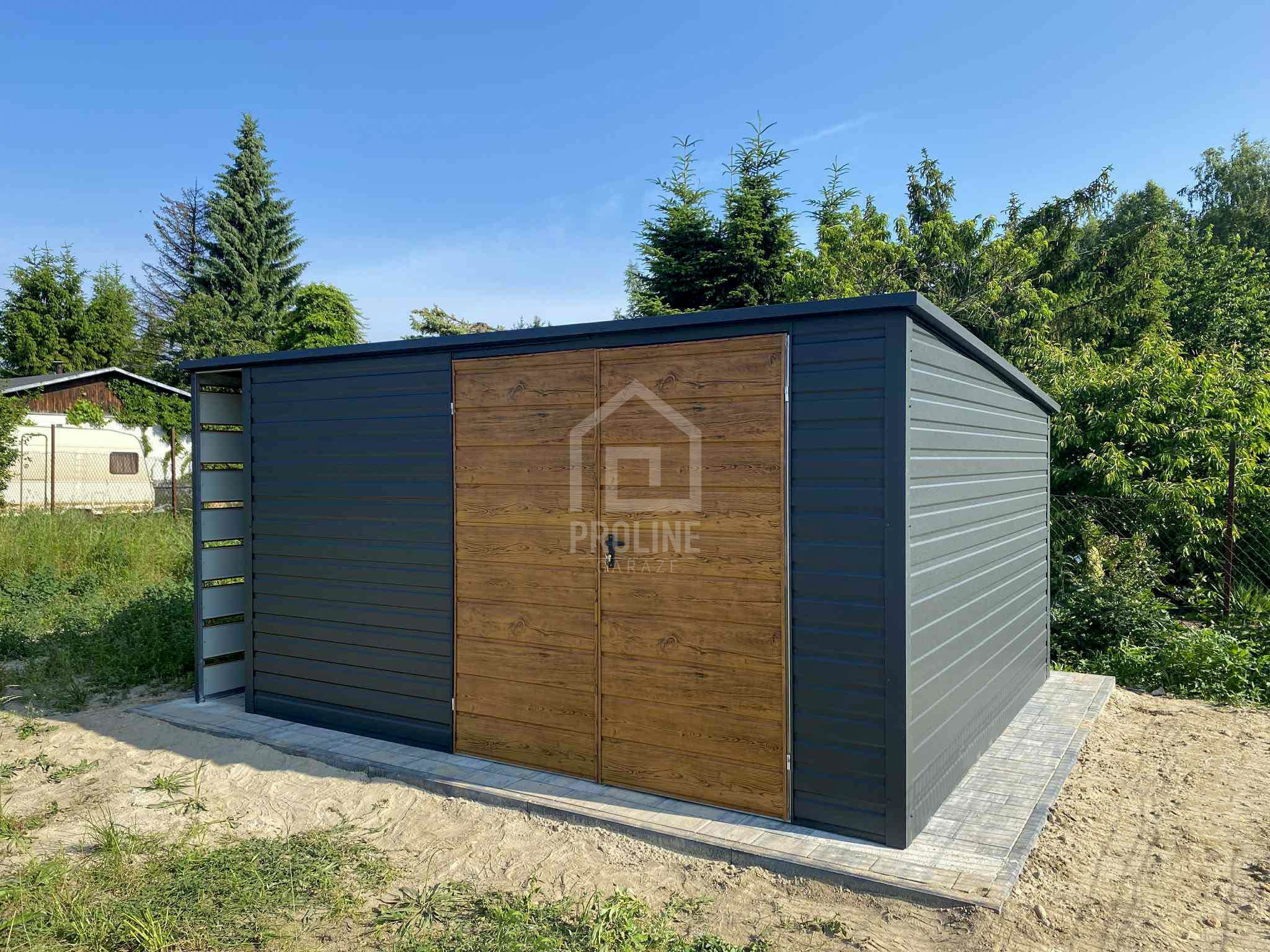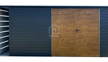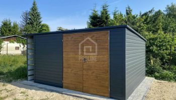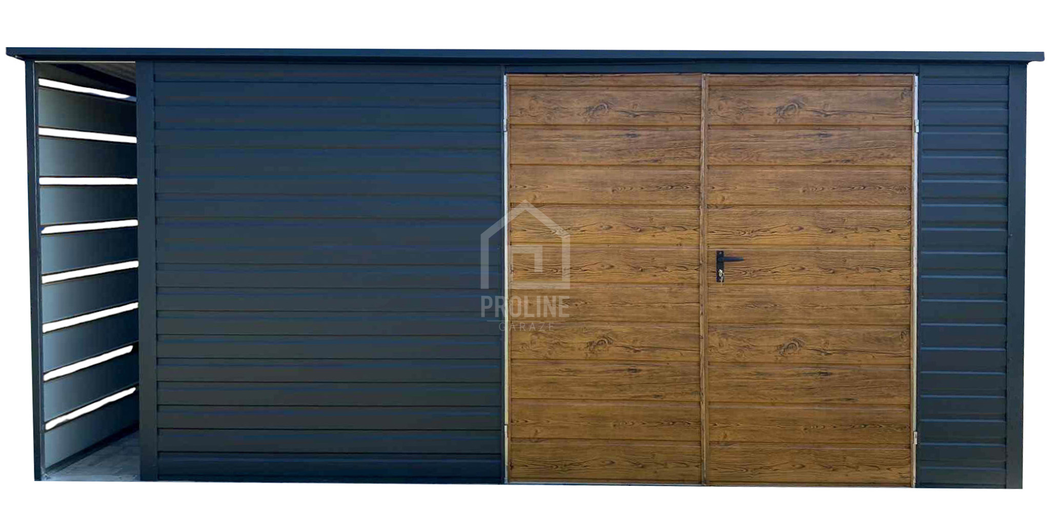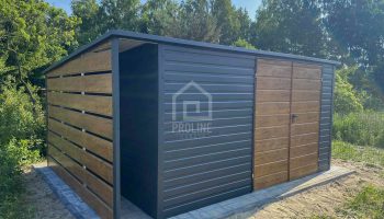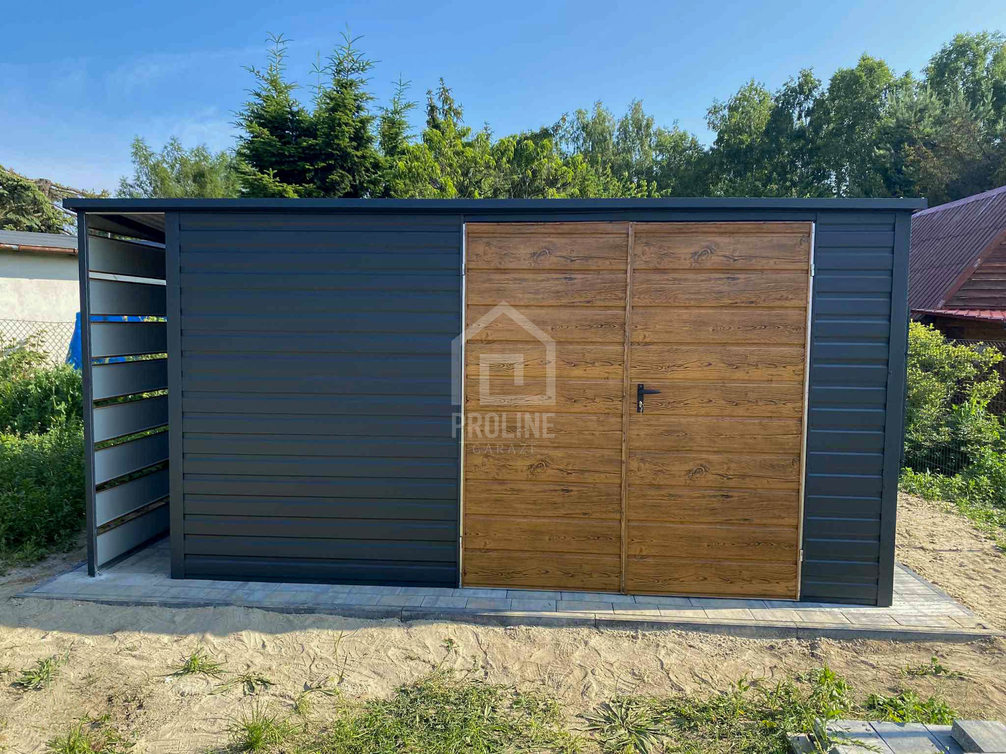 / Schowek – Domek Ogrodowy 4×3 – wiata 0,5×3 – brama – jasny orzech drewnopodobny – antracyt – dach spad w tył PLG166