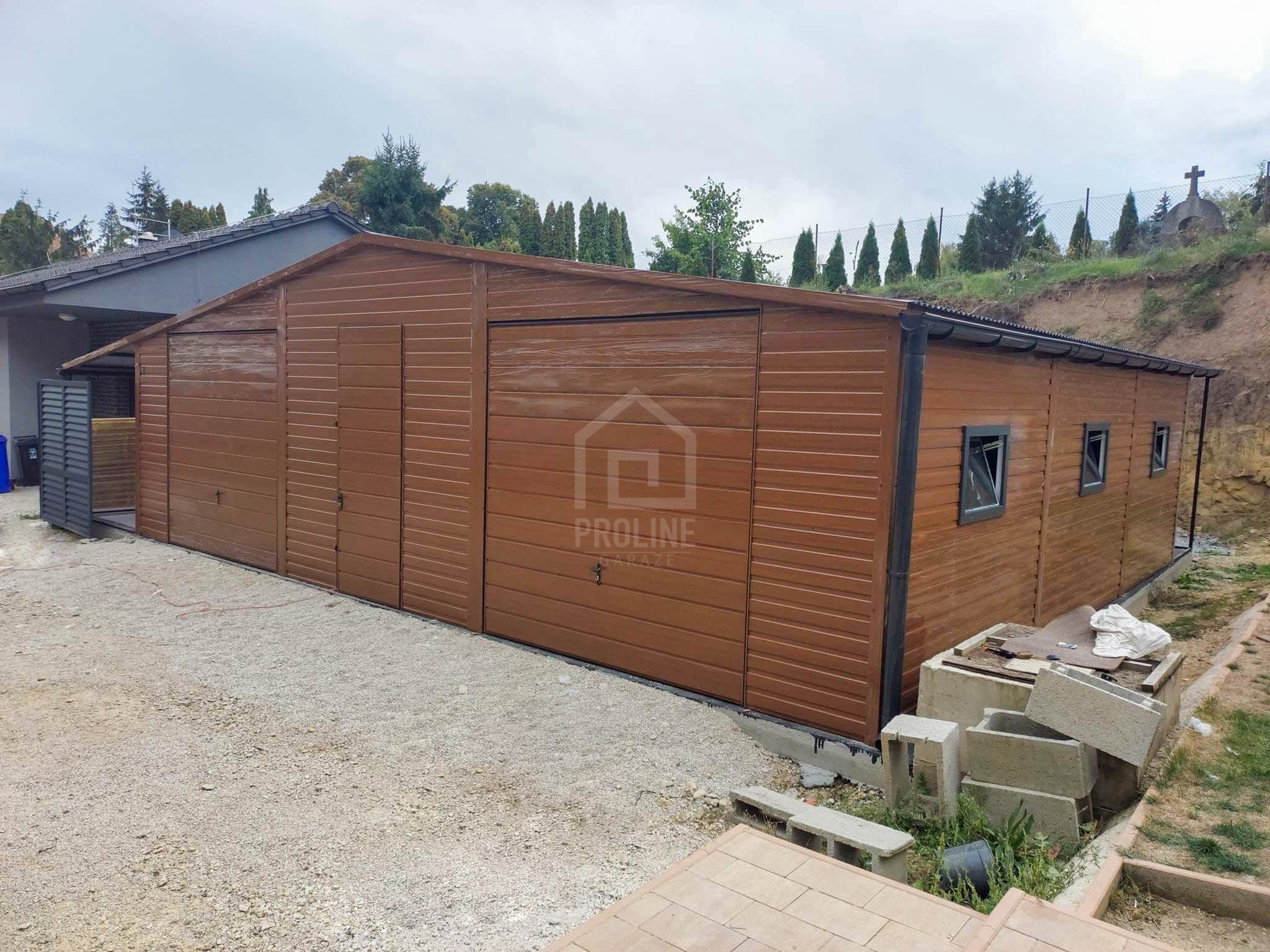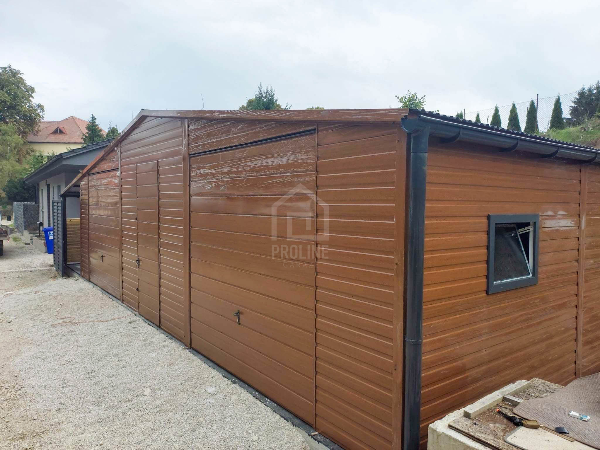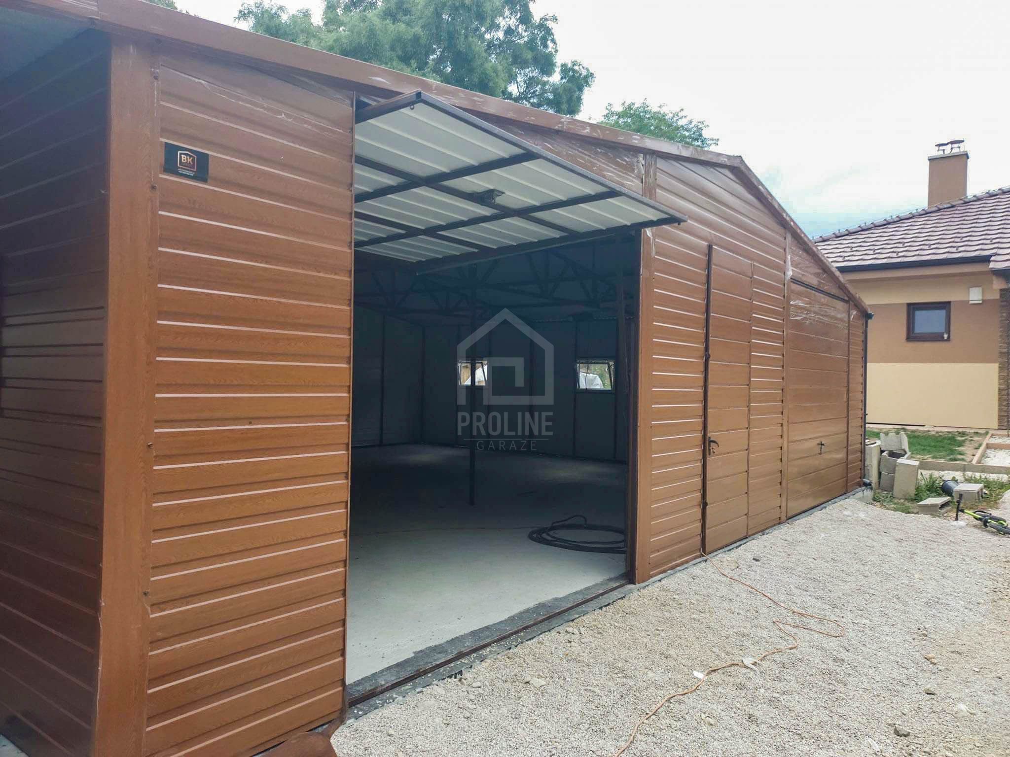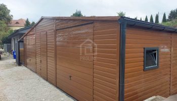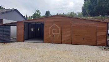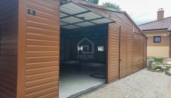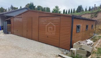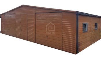 Garaż blaszany 11X7,5m – wiata 13x1m – wiata 2×7,5m – 2X brama – drzwi – 6x okno – drewnopodobny – dach dwuspadowy – rynny PLG242