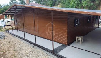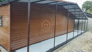 / Garaż blaszany 11X7,5m – wiata 13x1m – wiata 2×7,5m – 2X brama – drzwi – 6x okno – drewnopodobny – dach dwuspadowy – rynny PLG242
