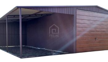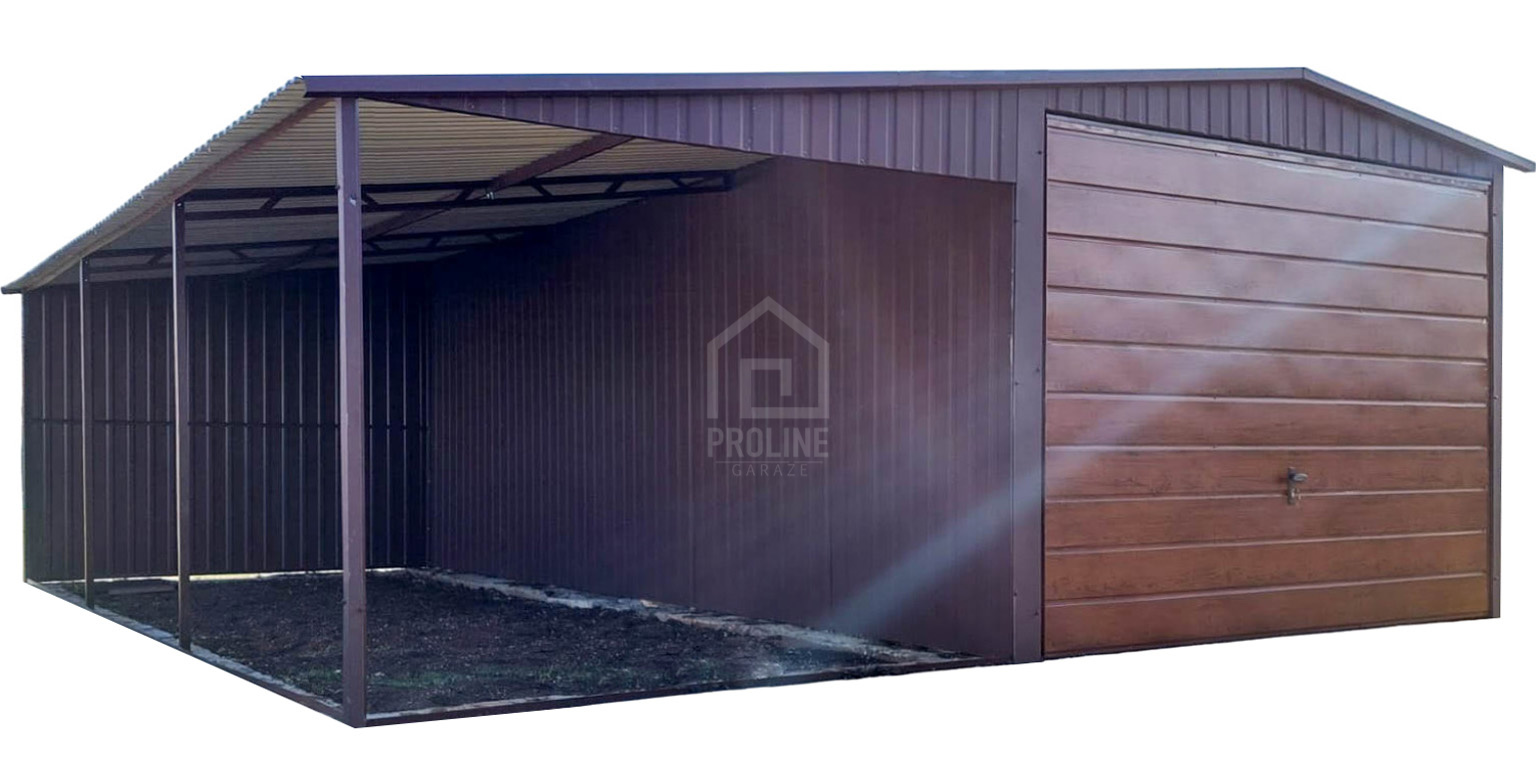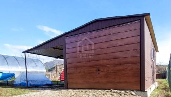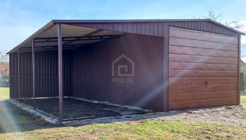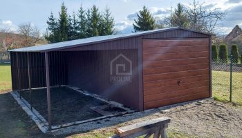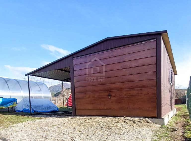 / Garaż blaszany 3x6m + wiata 3m – brama uchylna – okno – ciemny brąz – dach dwuspadowy PLG250