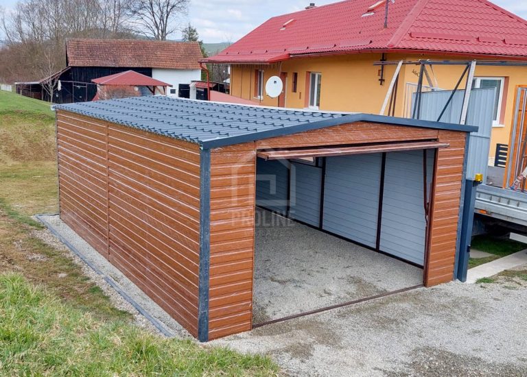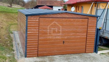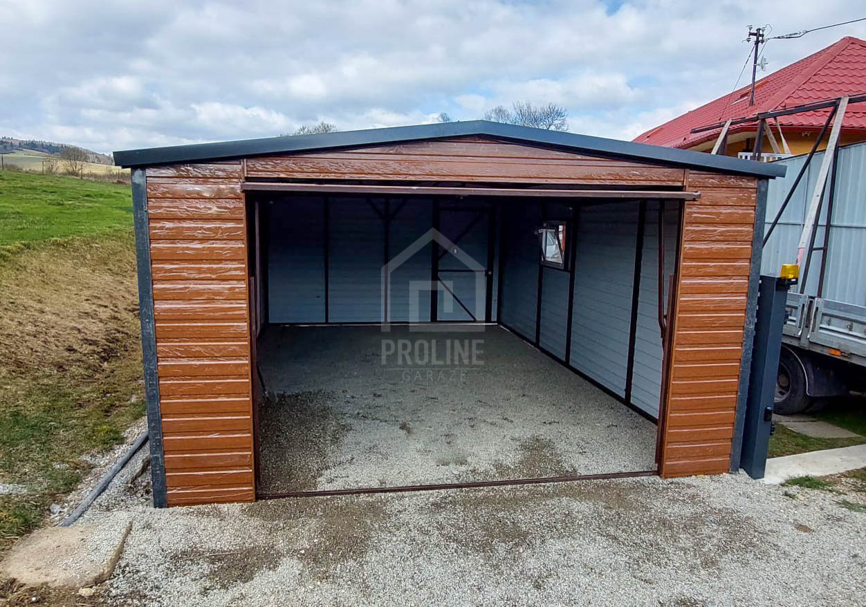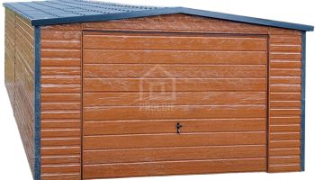 / Garaż Blaszany 4X6 – Dwuspad – Blachodachówka – Brama Uchylna – Drzwi – Okno – Drewnopodobny PLG225