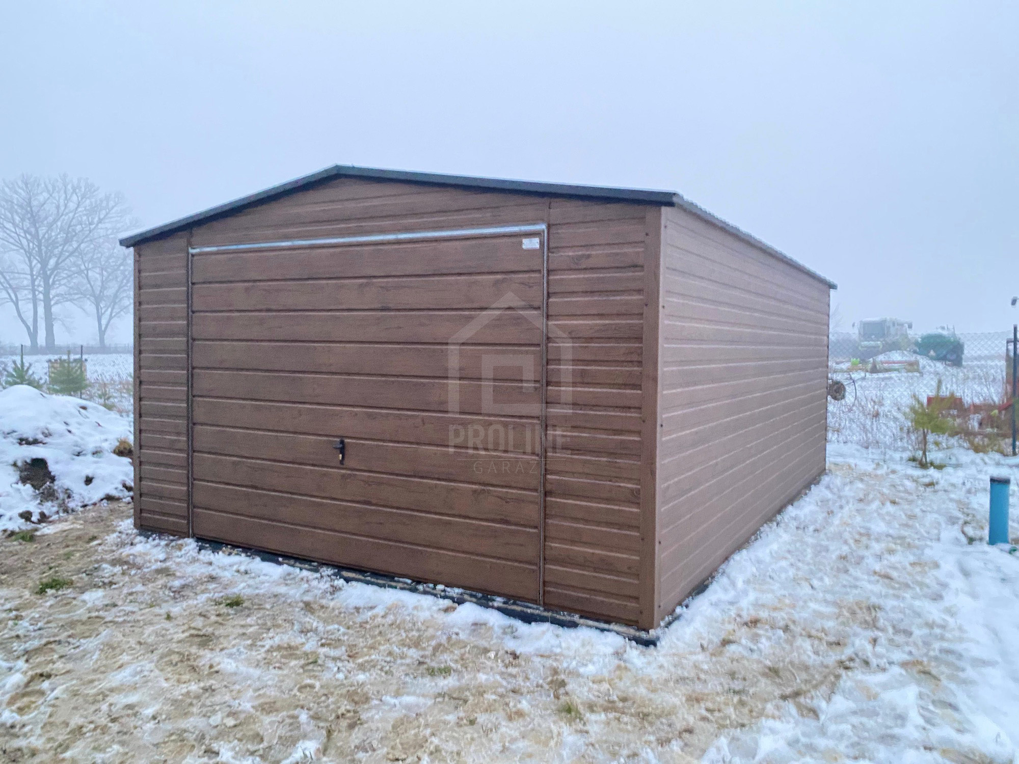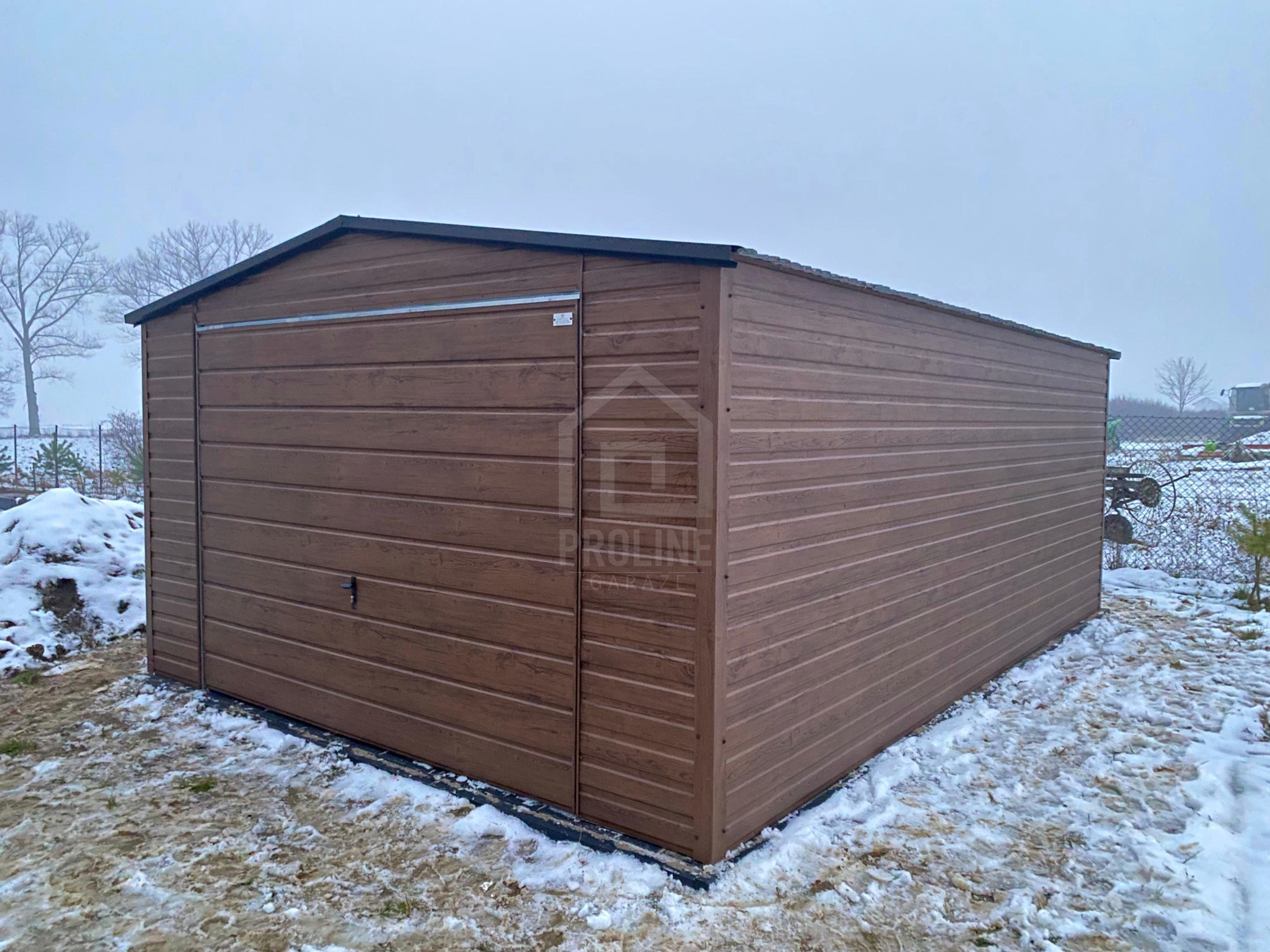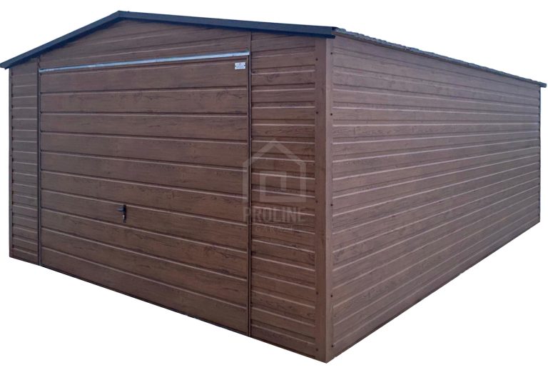 Garaż blaszany 4x5m – brama uchylna – ciemny orzech – drewnopodobny – dach dwuspadowy PLG253