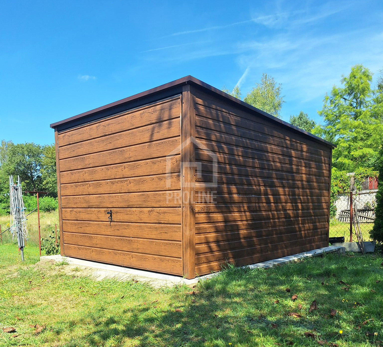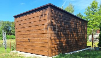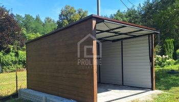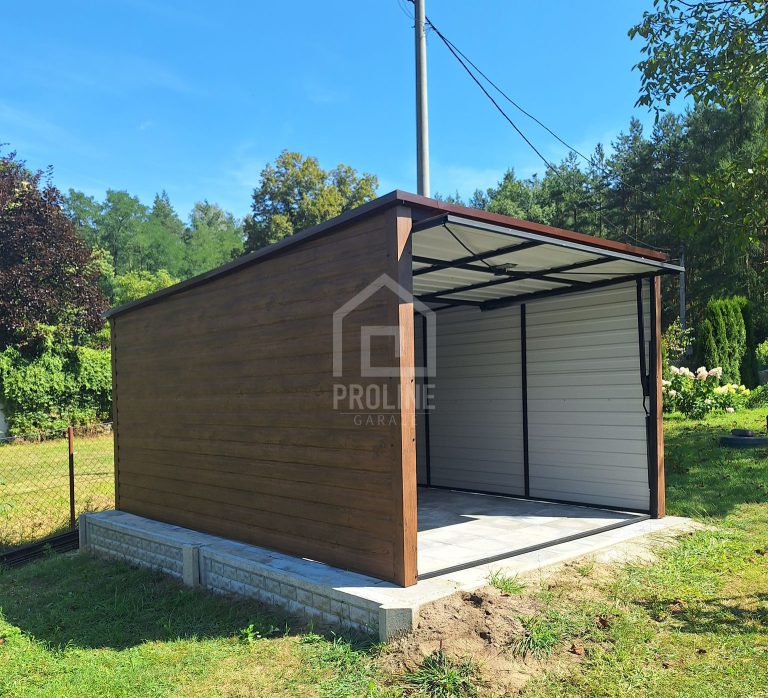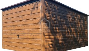 Garaż blaszany 3×4 Brama uchylna – jasny orzech drewnopodobny – Spad w tył PLG124