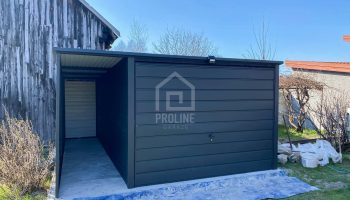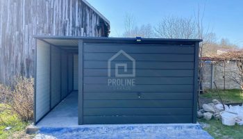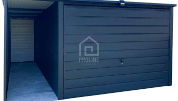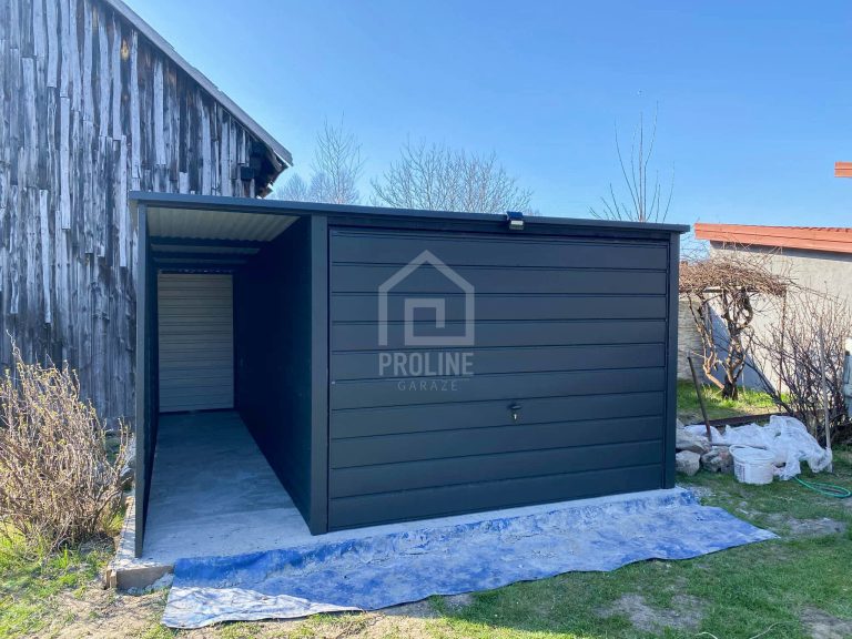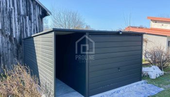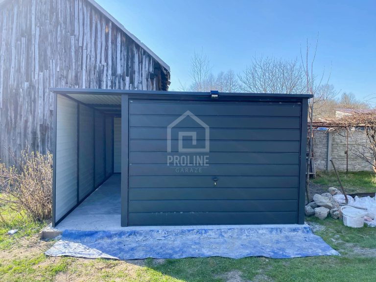 Garaż blaszany 3x4m – wiata 1m – Brama uchylna – Antracyt Dach spad w tył PLG171
