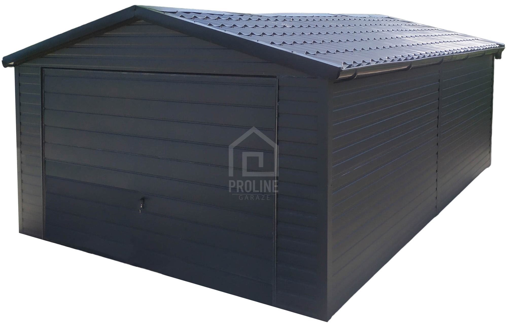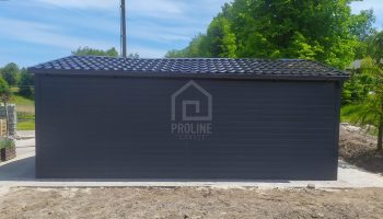 Garaż blaszany 4x6m – Blachodachówka – Brama uchylna – antracyt – rynny – dach dwuspadowy PLG175