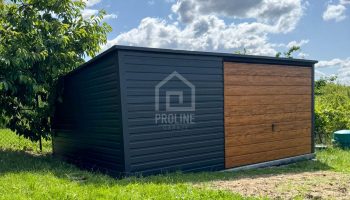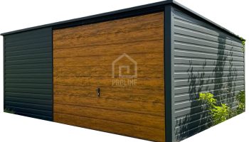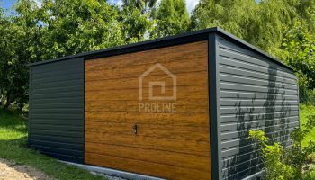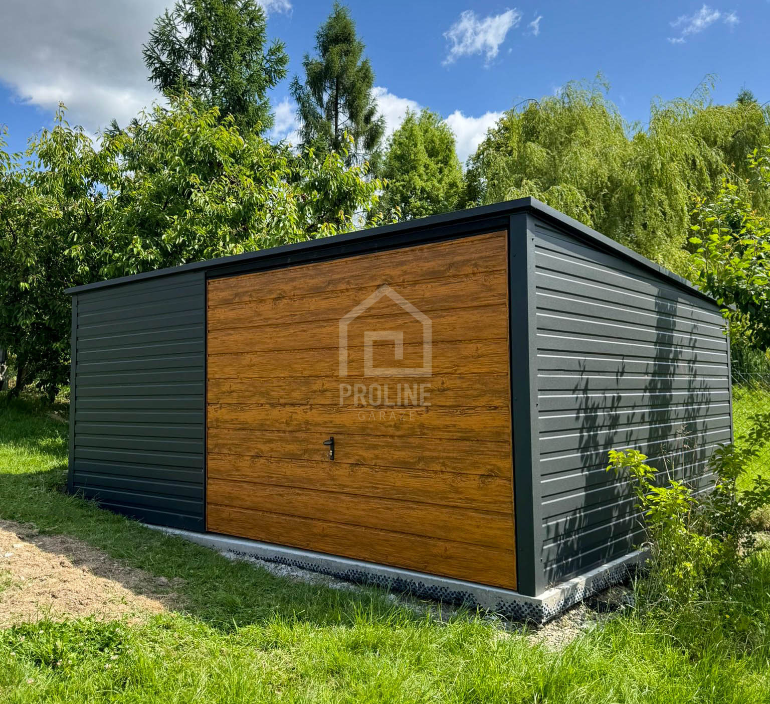 Garaż Blaszany 5×4 Brama uchylna – Antracyt + jasny orzech – drewnopodobny – dach Spad w tył PLG176