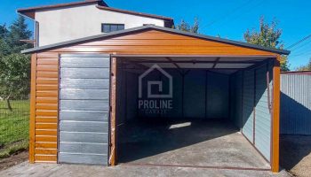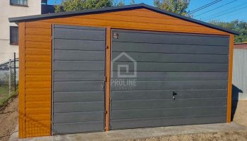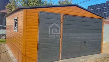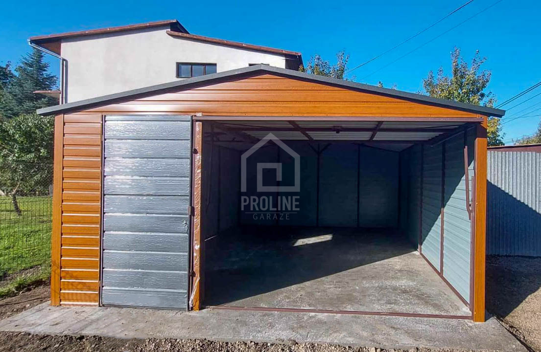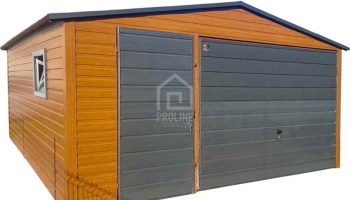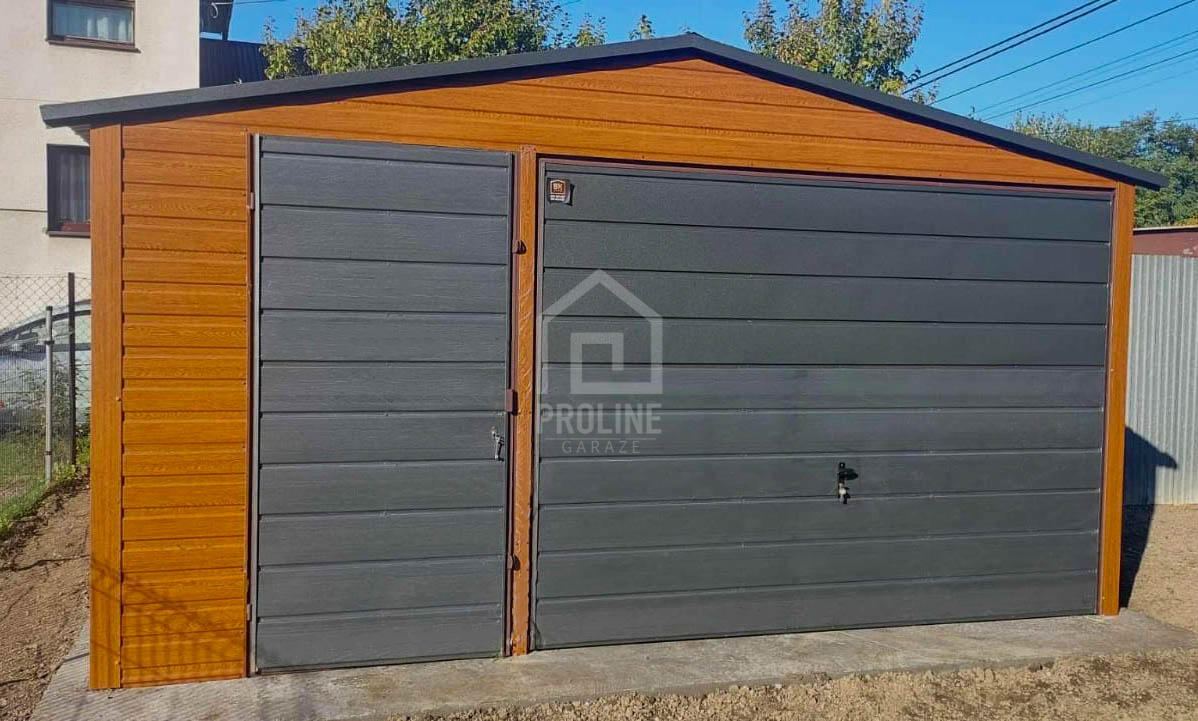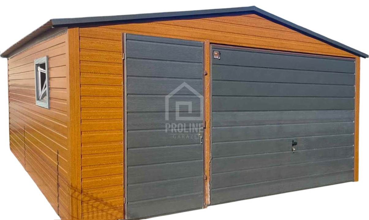 / Garaż blaszany 5×5 Brama + drzwi + okno – złoty dąb drewnopodobny Dach dwuspadowy PLG118