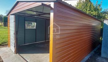 Garaż blaszany 5×5 Brama + drzwi + okno – złoty dąb drewnopodobny Dach dwuspadowy PLG118