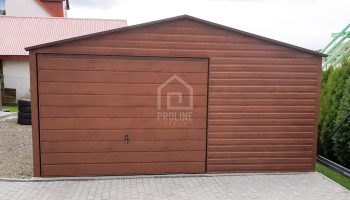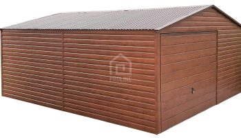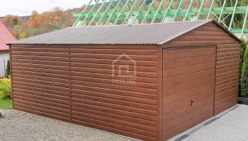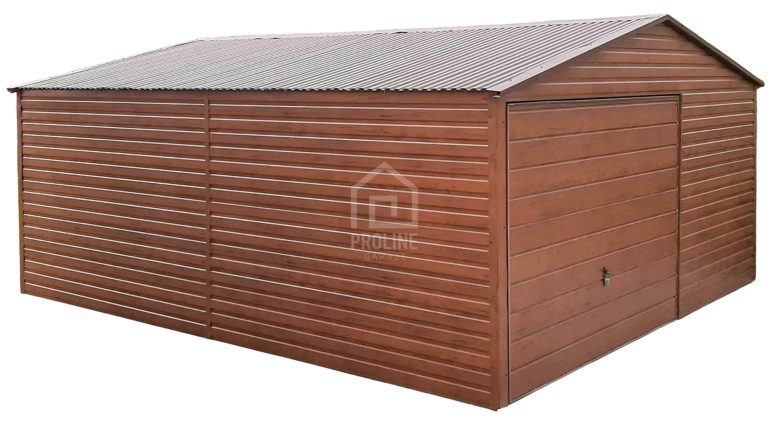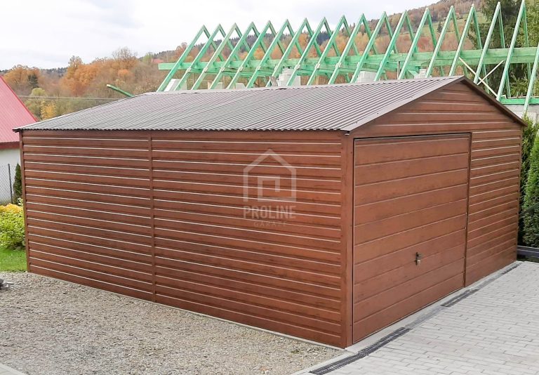 Garaż blaszany 5×5 Brama uchylna drewnopodobny Dach dwuspadowy PLG117