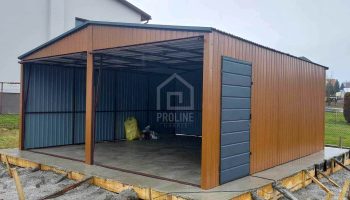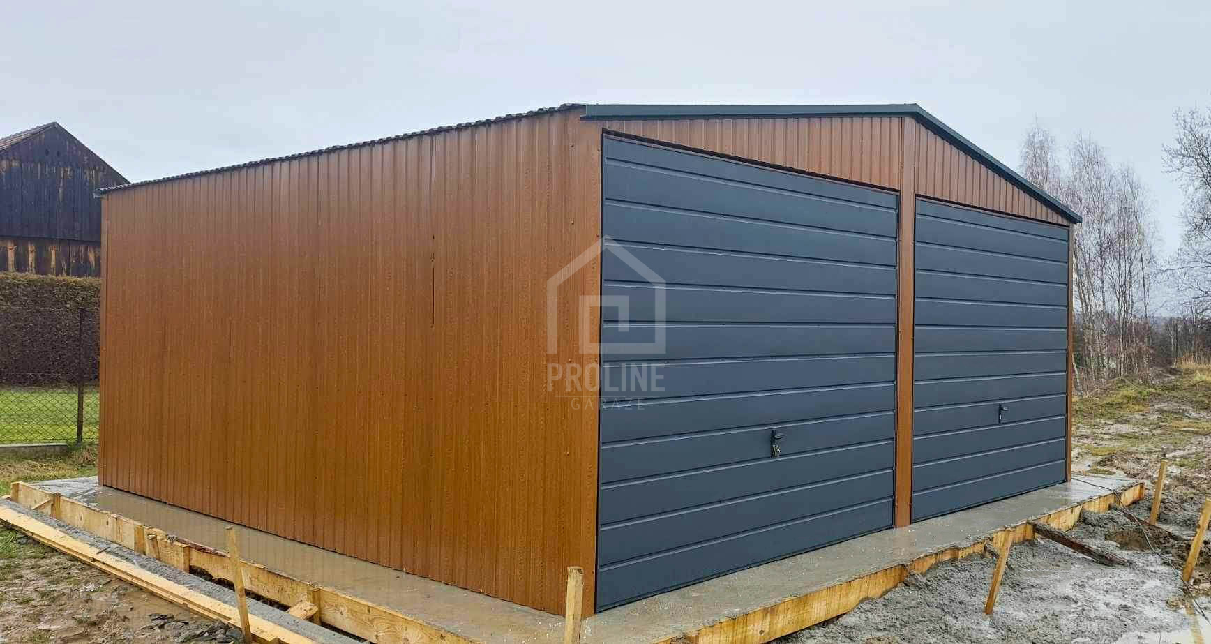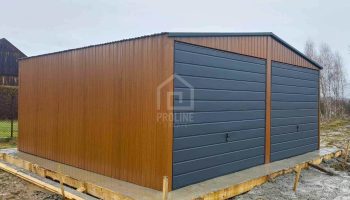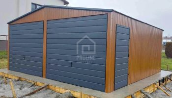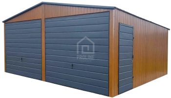 Garaż blaszany 6×6 2x Brama + drzwi jasny orzech drewnopodobny + antracyt Dach dwuspadowy PLG110