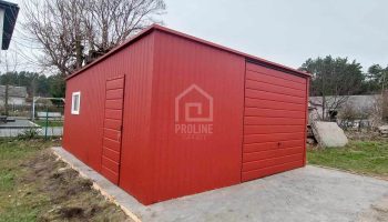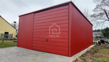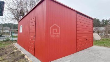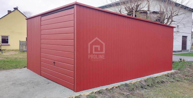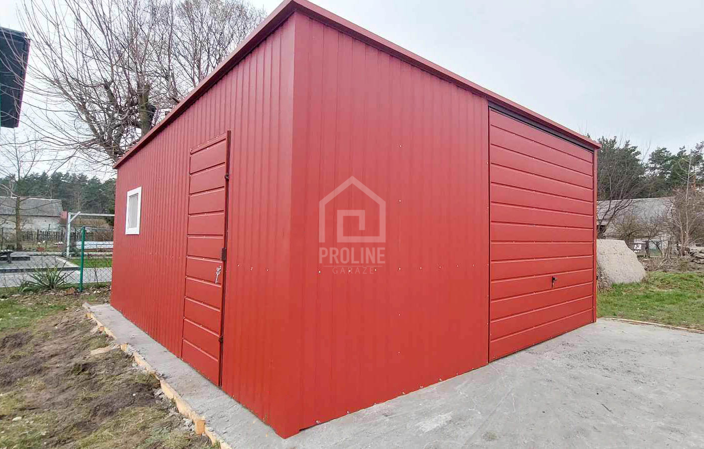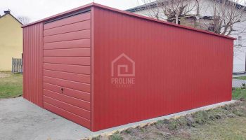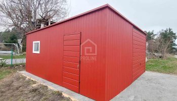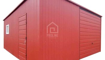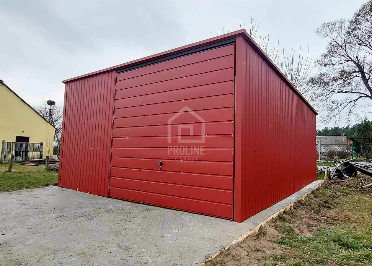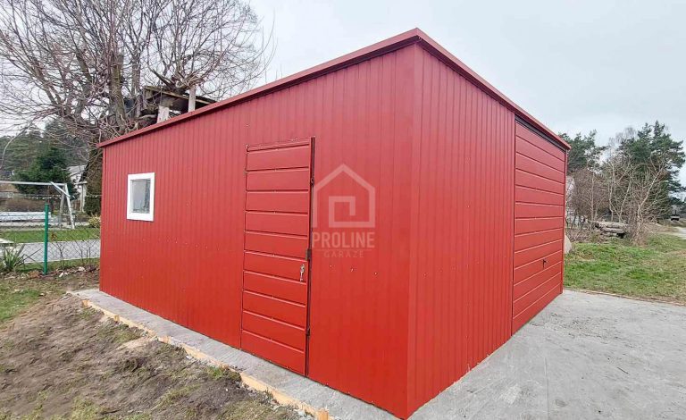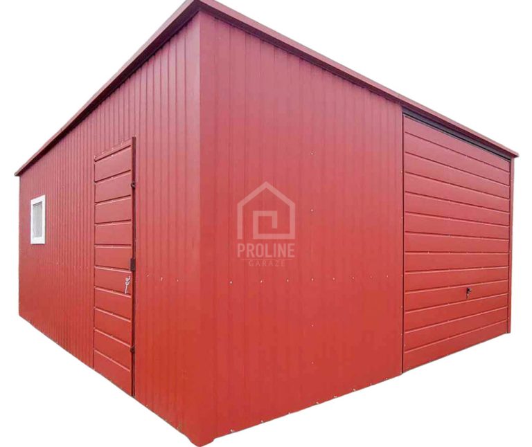 Garaż blaszany 6×6 – Brama uchylna – drzwi – jasny brąz – dach spad w tył PLG113