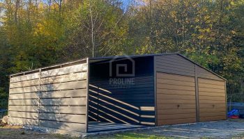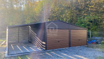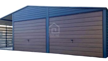 Garaż blaszany 6x6m – wiata 3m – 2x Brama – Antracyt – ciemny orzech – drewnopodobny Dach dwuspadowy PLG181