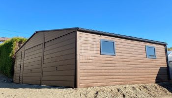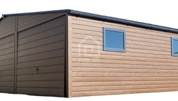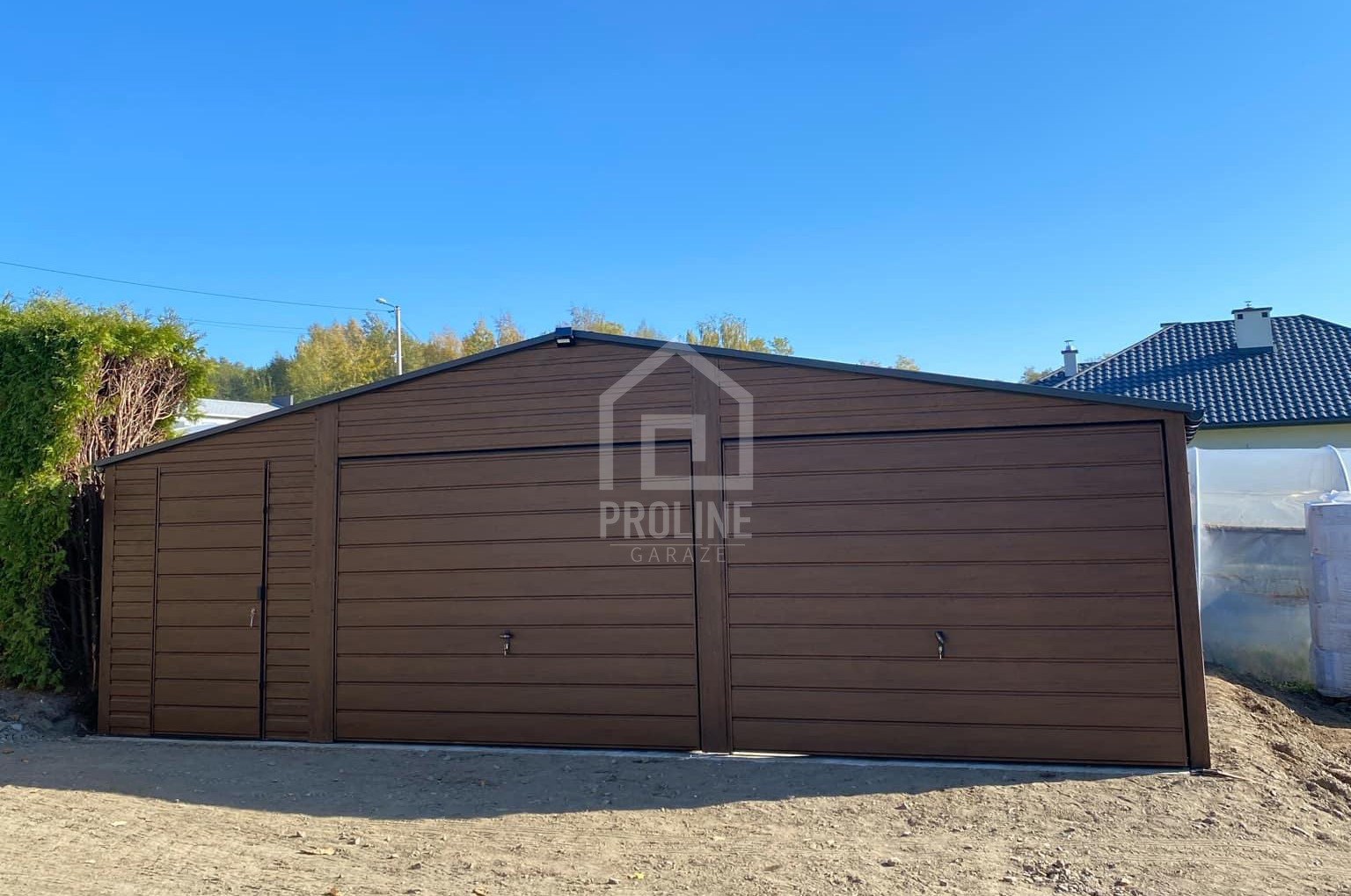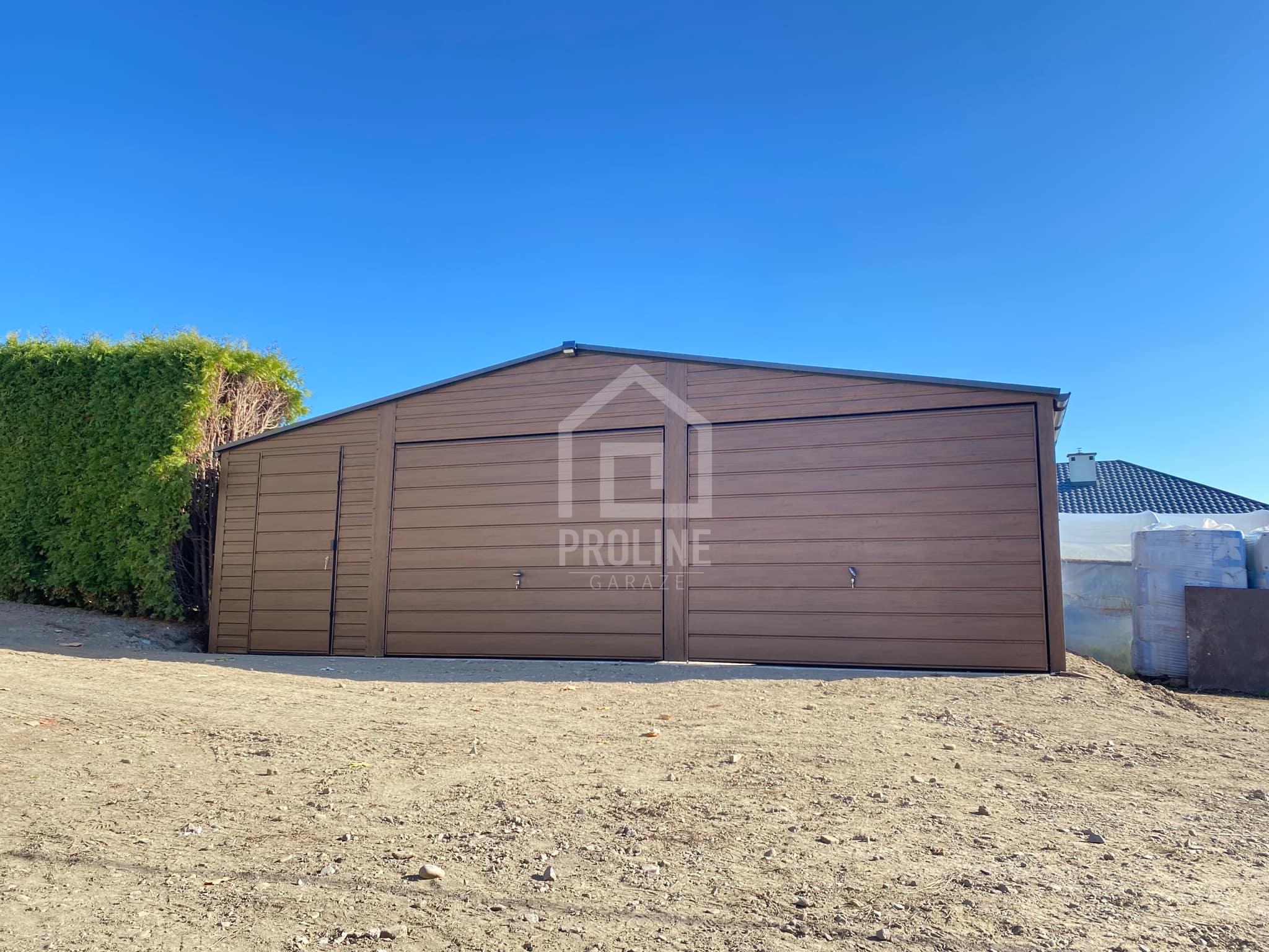 Garaż blaszany 8x6m – 2x Brama – drzwi – 2x okno – ciemny orzech – drewnopodobny – Dach dwuspadowy PLG183