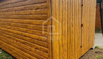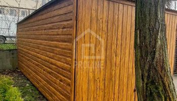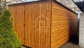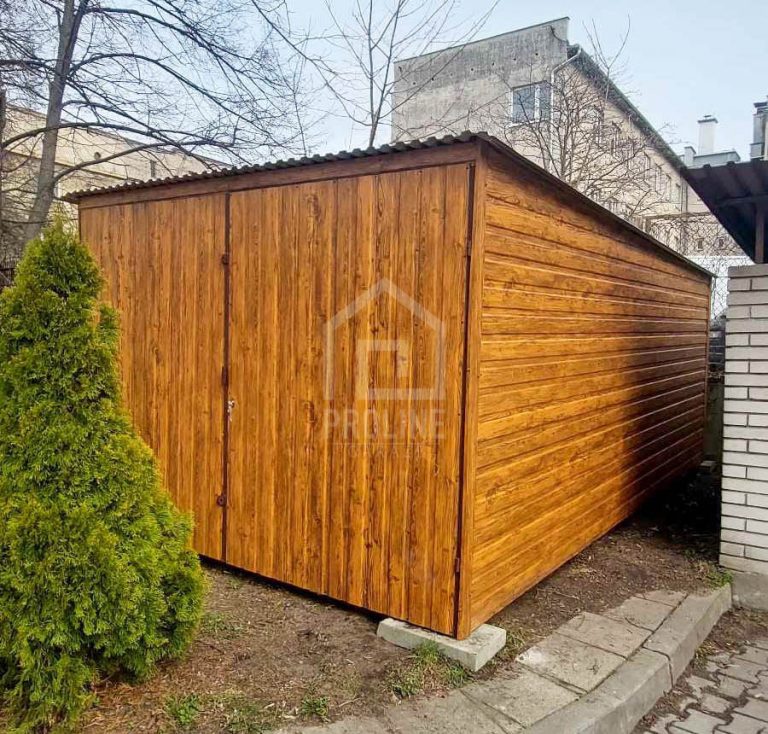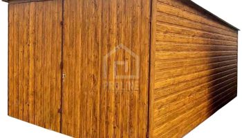 Garaż blaszany 3x5m – brama dwuskrzydłowa – jasny orzech – drewnopodobny – dach spad w tył PLG249